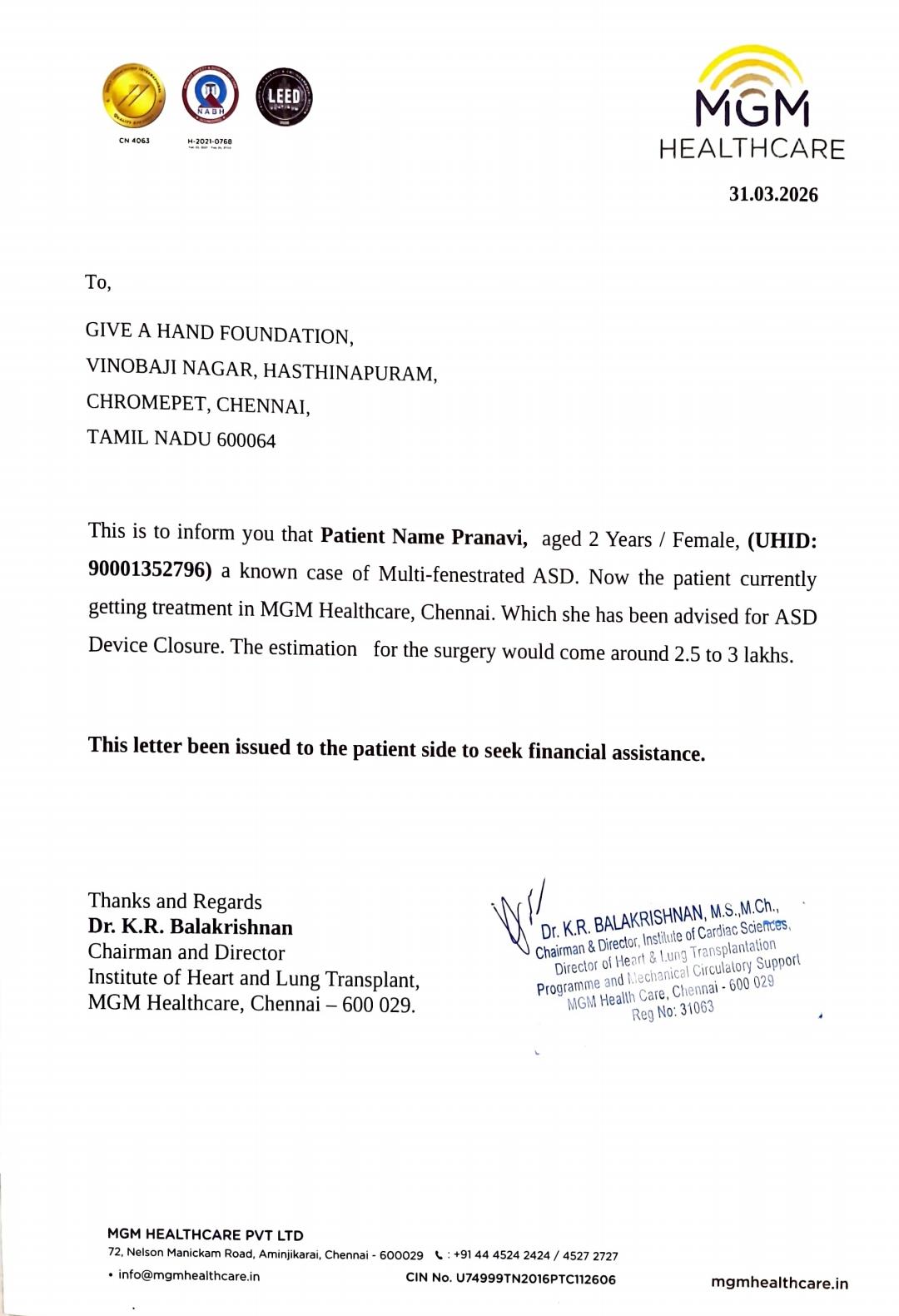 Pranavi, is a 2 years old Female child. Her father Mr. Balamurugan is working as a driver and her mother is a house wife. She is diagnosed with a known case of Multi-fenestrated ASD. Now the patient is currently getting treatment in MGM Healthcare, Chennai. Which she has been advised for ASD Device Closure. The estimation for the surgery would come around 2.5 to 3 lakhs.