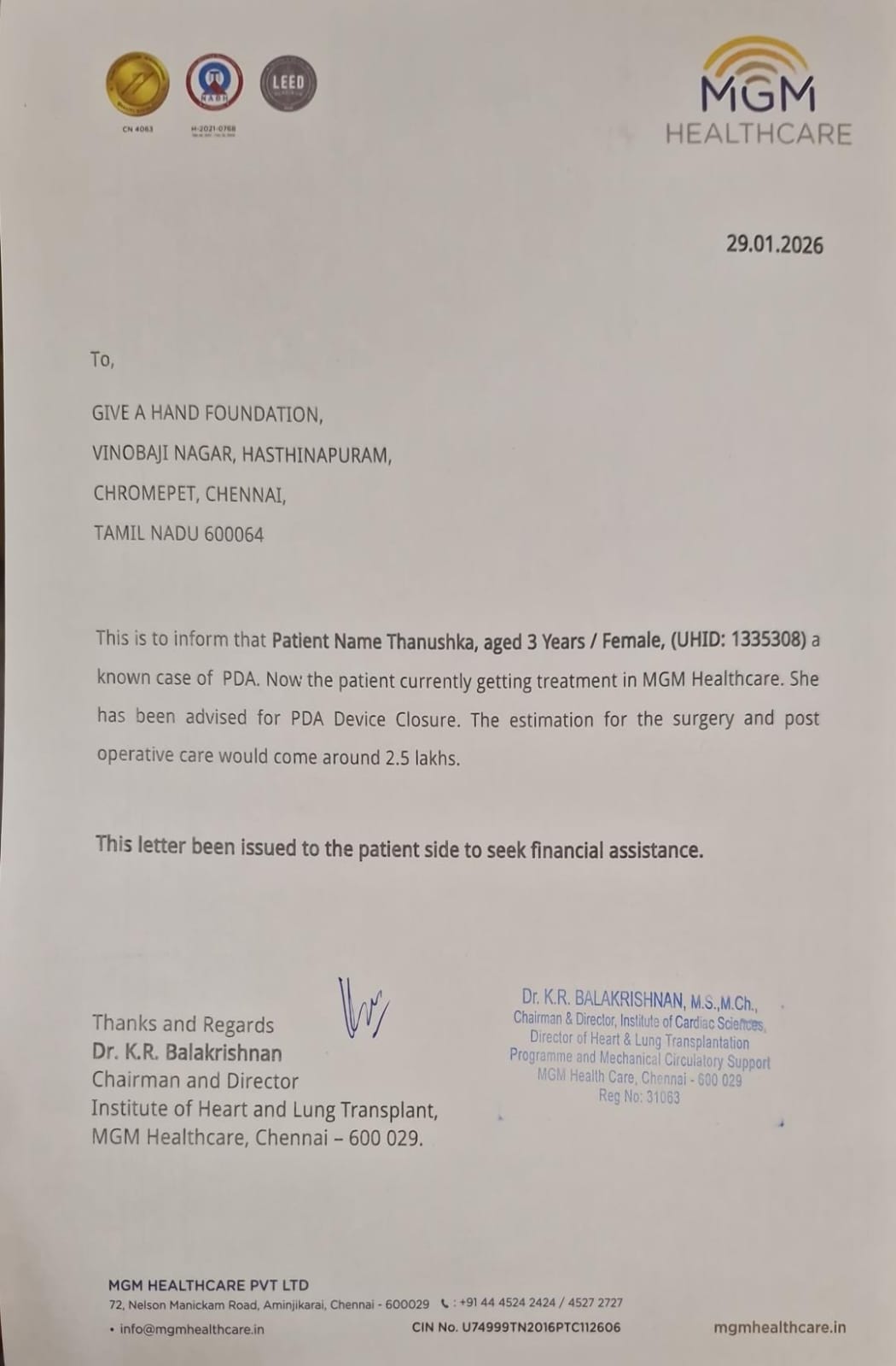 “I’m Kavitha, a single mother fighting for my 3-year-old daughter’s life. Diagnosed with PDA, she needs urgent Device Closure surgery at MGM Hospital, Chennai, costing Rs. 2,50,000.