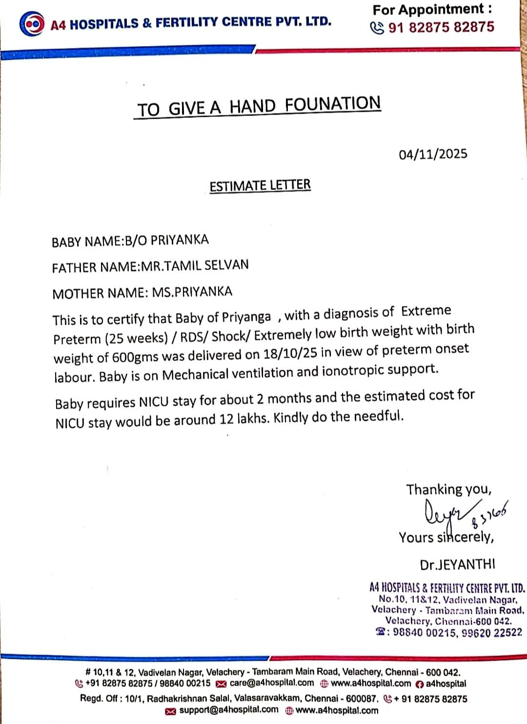 Now she is undergoing treatment in A4 hospital, Velachery, Chennai. Baby needs continued NICU Stay for about 2 months and baby is on ventilator support. Approximate expenditure for hospitalization is Rs. 12,00,000(Twelve Lakhs Only)