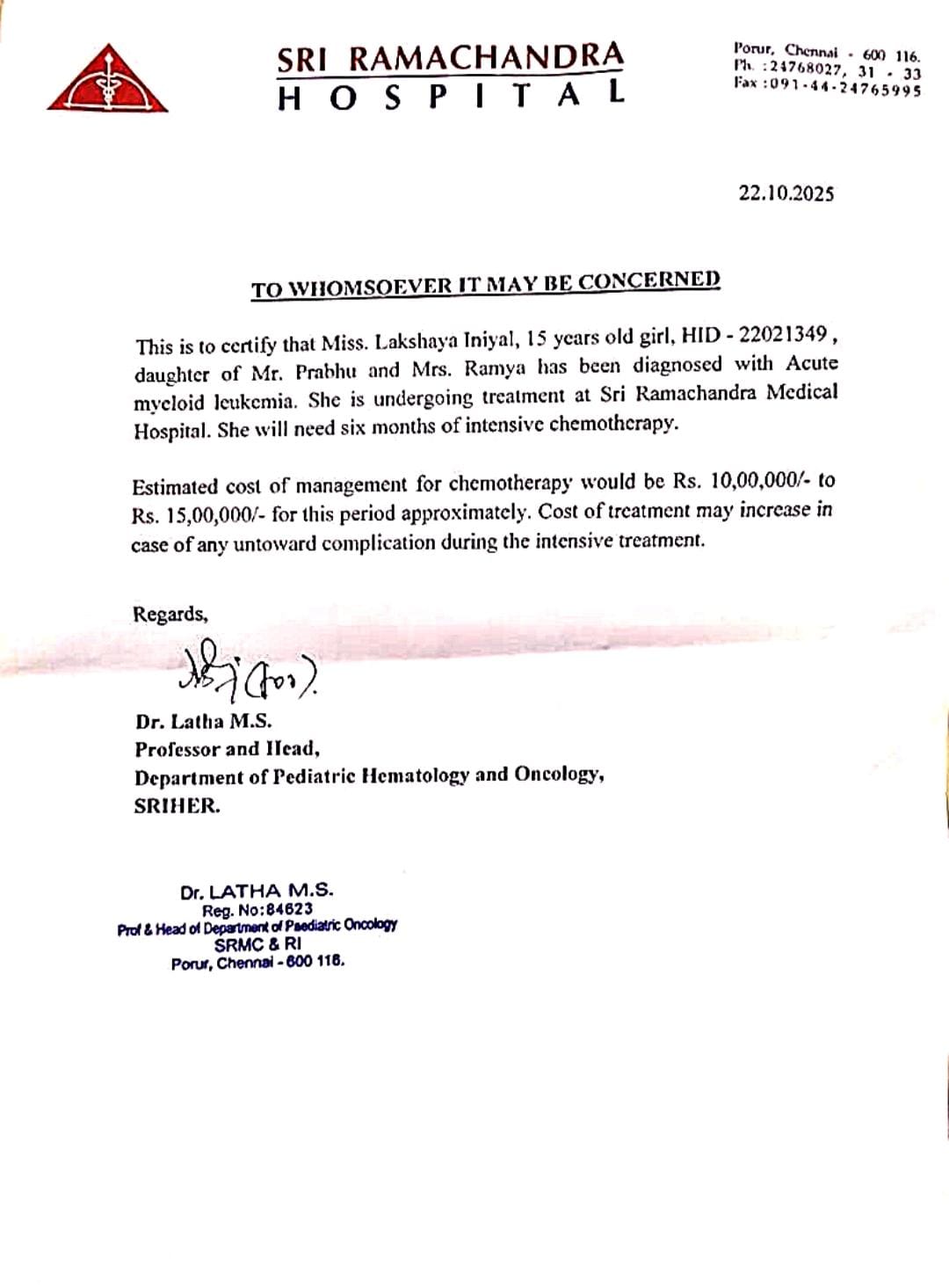 Now she is undergoing treatment in Sri Ramachandra Hospital, Porur, Chennai. She will need six months of intensive chemotherapy. Estimated cost of management for chemotherapy would be Rs. 15,00,000
