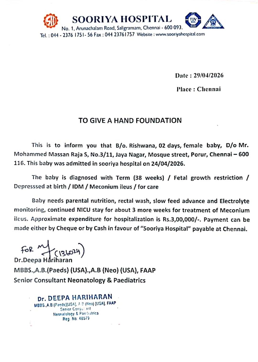 The baby is admitted in Sooriya Hospital Saligramam, Chennai.
