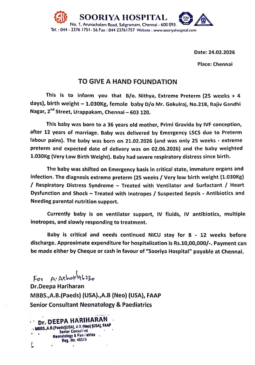 Now she is undergoing treatment in, Sooriya Hospital, Chennai. Approximate expenditure for hospitalization is Rs. 10,00,000(Ten Lakhs Only)